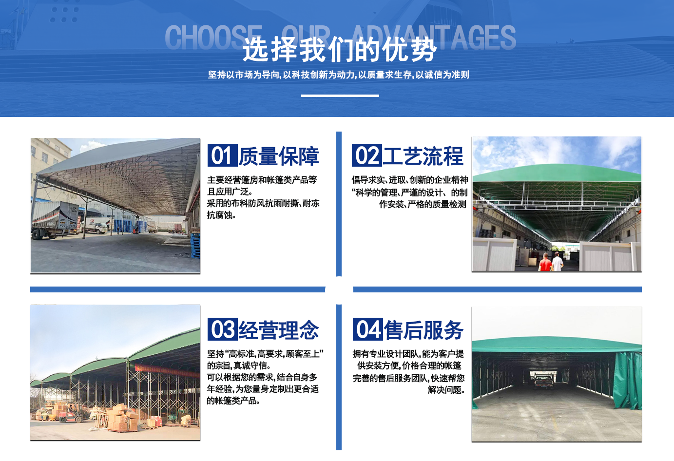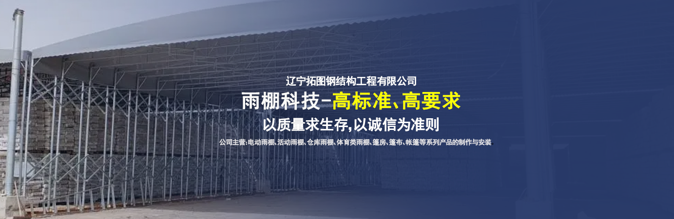 遼寧拓圖鋼結構工程有限公司是一家專業從事推拉篷設計、制作、安裝、使用、維修的綜合性公司。公司主營:電動雨棚、活動雨棚、倉庫雨棚、體育類雨棚、篷房、篷布、帳篷等系列產品的制作與安裝。 遼寧拓圖鋼結構工程有限公司堅持以市場為導向,以科技創新為動力,以質量求生存,以誠信為準則,倡導求實、進取、創新的企業精神。“科學的管理、嚴謹的設計、 的制作安裝、嚴格的質量檢測、良好的后期服務成就企業的信譽,為您提供優質服務?! ?nbsp; 遼寧拓圖鋼結構工程有限公司傾力于開發應用三維空間結構與新材料的結合,將廣告藝術視覺表現形式與張力膜材科學的結合,推出多彩推拉蓬,依靠先進的科學技術,將推拉蓬建筑表現形式無限延伸,立志走在建筑科學的前沿,引導建筑時尚潮流,我們的目標是使推拉蓬建筑在中國發展壯大。 遼寧拓圖鋼結構工程有限公司憑著極強的事業熱情和豐富的專業經驗以“勤勉進取、銳意創新、至誠至信”的精神使公司得到迅速健康發展,業務范圍遍及全國。科學的管理、嚴謹的設計、高標準的制作安裝流程,嚴格把控產品質量,熱誠的售后服務是企業競爭力的源泉?! ?nbsp; 遼寧拓圖鋼結構工程有限公司人愿以最誠摯的態度,歡迎廣大客戶的蒞臨與溝通!愿為市場提供優...